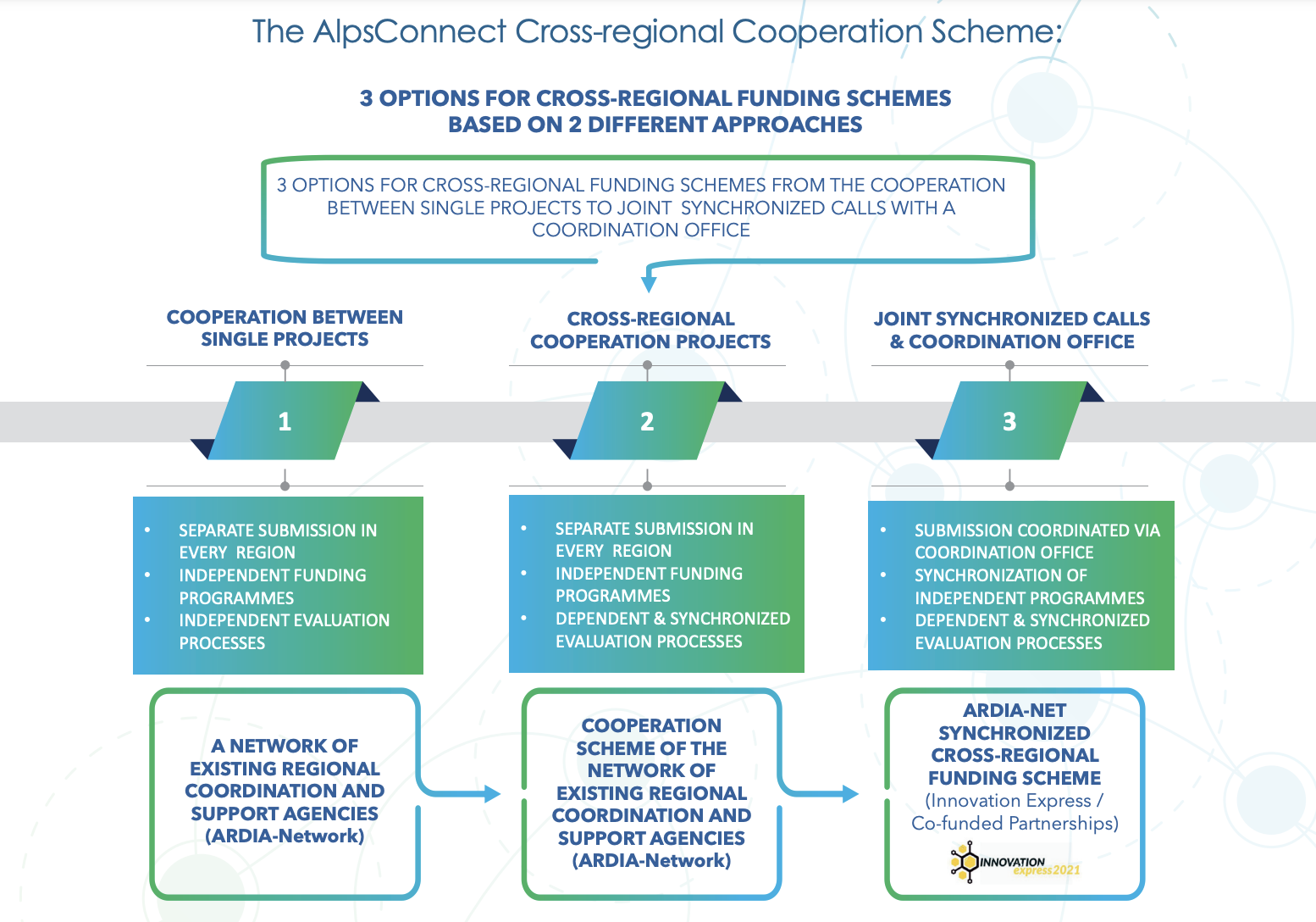 Das „AlpsConnect Scheme“ wurde im Projekt ARDIA-Net entwickelt, das drei Optionen zur überregionalen Zusammenarbeit aufzeigt. © ADRIA-Net (2022)Um die überregionale Zusammenarbeit zu erleichtern, wurde im Projekt ARDIA-Net das „AlpsConnect Scheme“ entwickelt, das drei Optionen zur Unterstützung überregionalen F&I-Zusammenarbeit bietet und damit die entsprechende Finanzierungslücke schließt. Die Auswirkungen und Veränderungen lassen sich nicht leicht quantifizieren, aber die Organisation und Durchführung eines Pilotaufrufs „Innovation Express 2021“ mit Beteiligung von vier Regionen (Baden-Württemberg, Brandenburg, Kanton Fribourg und Salzburg) hat gezeigt, in welchem Maße die von ARDIA-Net vorgeschlagenen Mittel und Instrumente angewandt werden können. Baden-Württemberg war bei der Planung und Durchführung des Förderaufrufs federführend beteiligt und zwei baden-württembergische Firmen waren in Projektanträgen vertreten. Diese beiden Projektergebnisse waren die Diskussionsgrundlage für das erste Panel auf der Abschlusskonferenz. Dabei stellte sich heraus, dass die Zeichen für überregionale Zusammenarbeit nicht günstiger sein könnten, es bedarf jedoch „mutiger Regionen“, die bereit sind Geld und Zeit zu investieren.